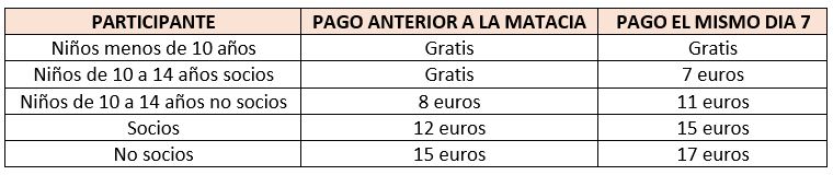 A continuación, se exponen la tabla de precios para la MATACIA 2025.