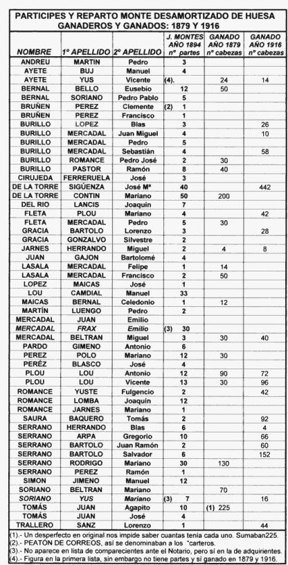 .- Dividir el terreno de la presente escritura en 406 partes o porciones iguales, cada una de las cuales diese derecho al dueño de las mismas a introducir en el terreno 10 cabezas de ganado lanar o cabrío, no contando para ello las reses nacidas cada año entre el primero de Enero y el primero de Noviembre, derecho que ya se venía disfrutando desde la formación del convenio. (Este dato nos aporta un muy aproximado censo ganadero de Huesa, o al menos la capacidad ganadera de por aquel entonces. Esas 406 partes x 10 cabezas /parte nos hace una cabida de 4.060 cabezas de ganado, a las que habría que añadir las nacidas en el año).