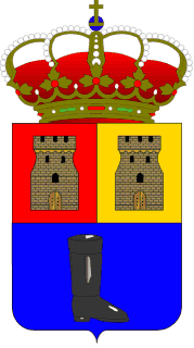 Usa escudo semipartido y cortado; primero, de gules, una torre, de su color, segundo, de oro, una torre de su color. En el tercero, de azur, bota alta de monta en sable, contornada. Emplea como timbre corona real cerrada.