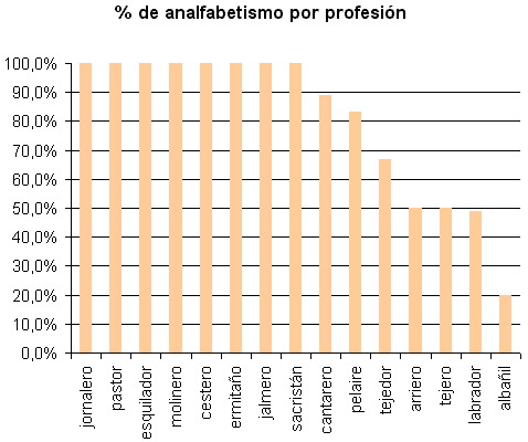 El elevado índice de varones analfabetos de esa época no estaba repartido uniformemente en todos los estratos sociales y laborales, como es lógico. No había analfabetismo entre quienes se dedicaban a oficios administrativos o funcionariales. En cambio, comprobamos cómo los porcentajes por oficio son elevadísimos entre los trabajadores del campo menos cualificados (ningún jornalero, pastor, esquilador mayor de 25 sabía leer, y sólo la mitad de los labradores).