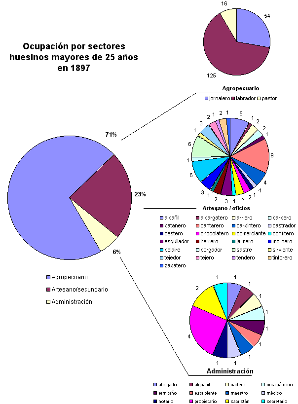Otro de los datos más útiles para conocer la realidad de la sociedad huesina y su nivel de modernización es el análisis de los oficios de los censados. Constan 40 oficios diferentes (10 más que en el vecino pueblo de Blesa a pesar de que allí había 303 electores), pero analizando la cantidad de habitantes que dependen de la agricultura y la ganadería, se pone en evidencia que prácticamente toda la población giraba en derredor suyo.