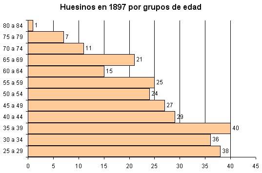 Como toda la población de pujante vitalidad, la sociedad huesina de entre siglos estaba formada por una mayoría de jóvenes, en este caso, el 20% de los varones serían menores de 25 años y no están representados en el gráfico siguiente.