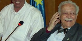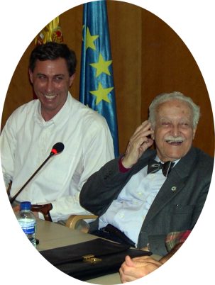 D. Antonio Beltrán (a la derecha) en un momento de júbilo durante la presentación de “Ossa. Vida e historia”.