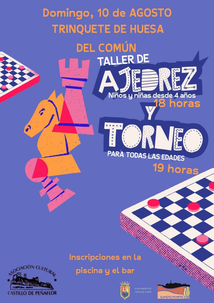 El proximo domingo 10 de agosto a partir de las 18h tendra lugar un taller de ajedrez para niños desde 4 años y posteriormente un torneo de partidas rapidas para todas las edades.