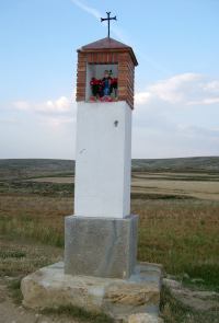 “De construcción rústica (piedra y ladrillo forrados de yeso), no muy alto y sin ningún adorno”, protegía la entrada de “Plou (hay que recordar que este camino subía por el llamado “atajo” hasta la Loma de la Horca)”